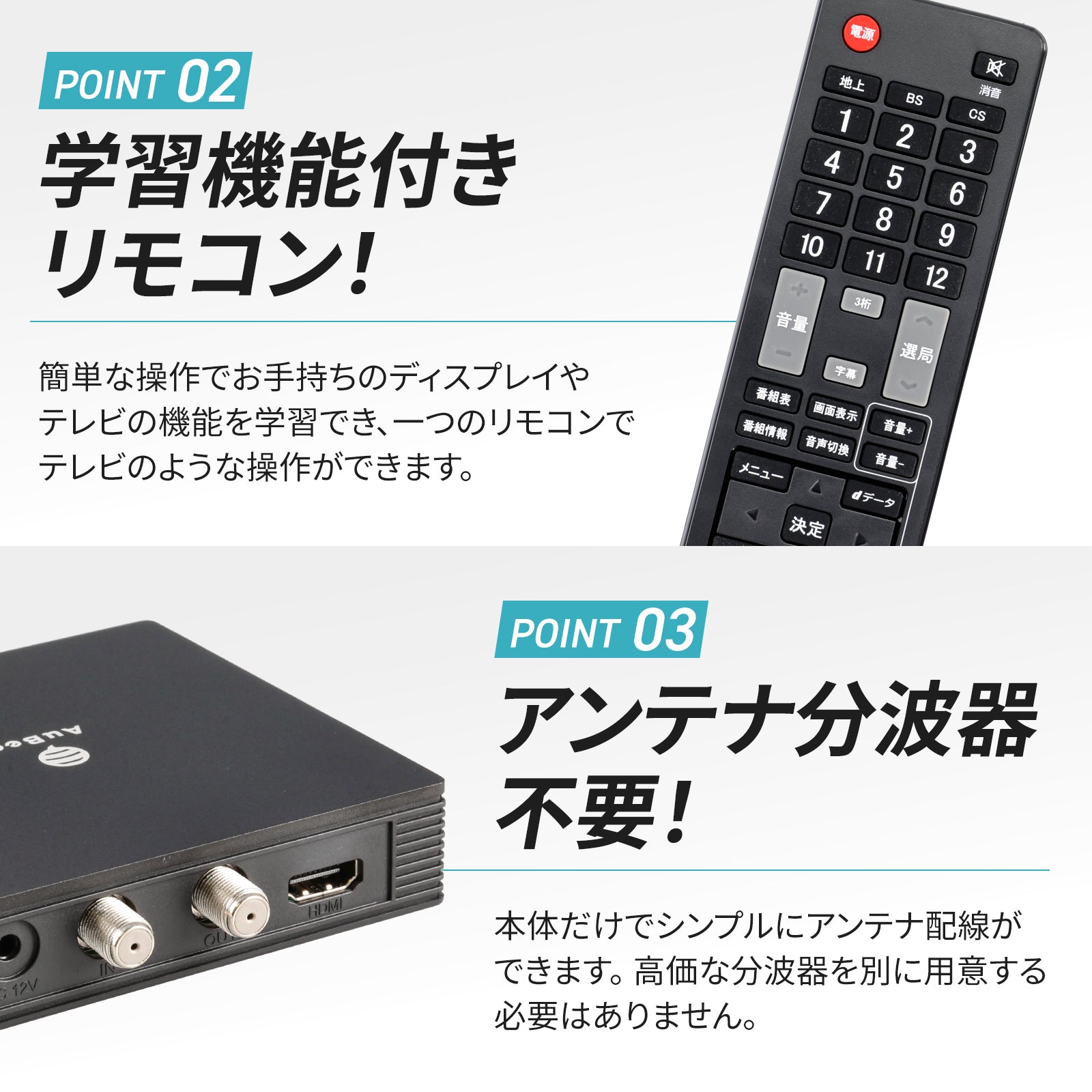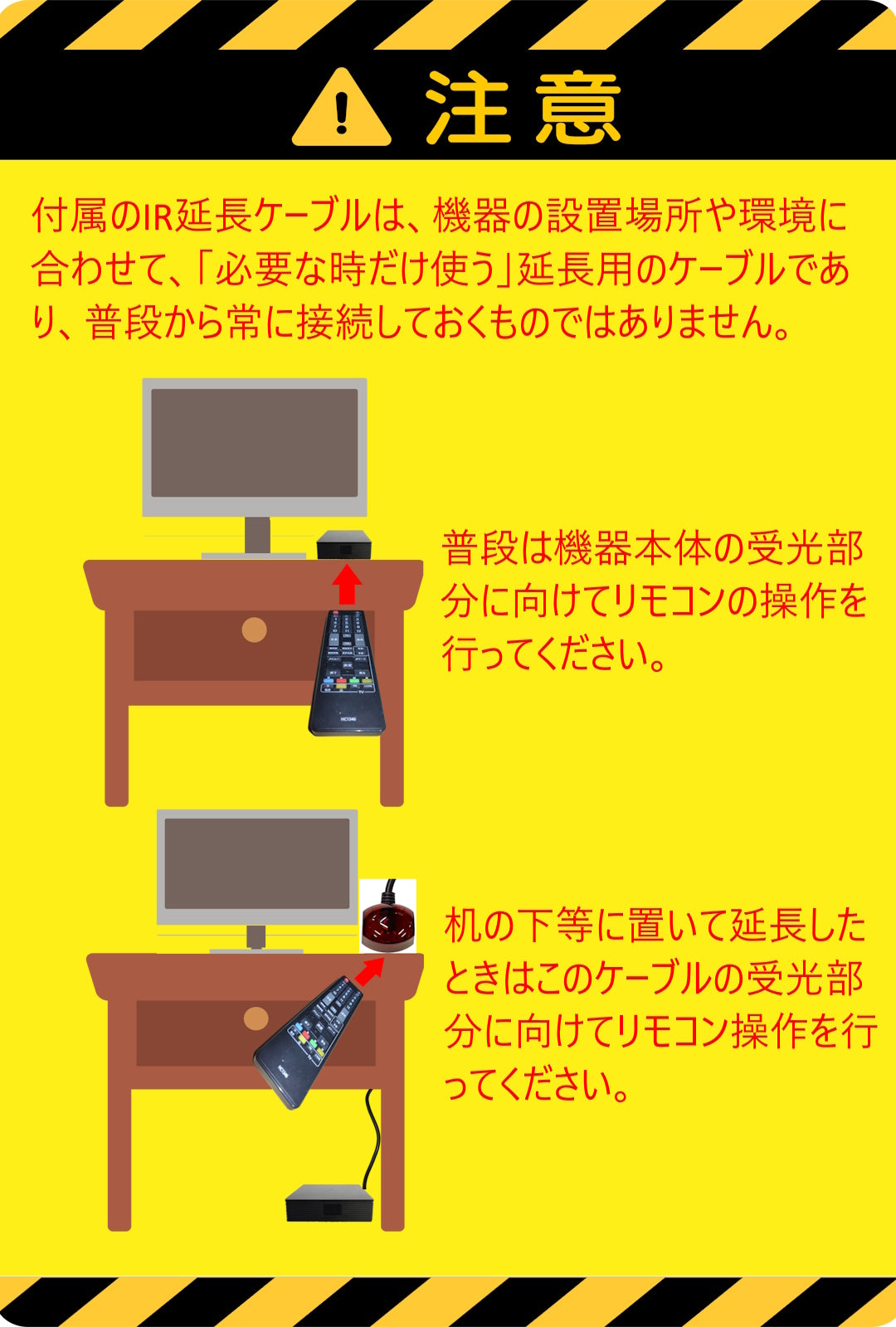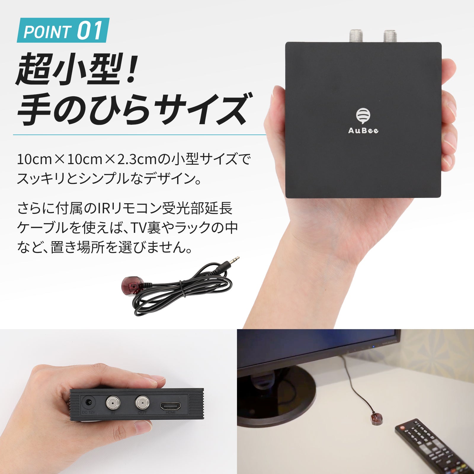 ◆場所をとらない、場所を選ばない 超小型で場所をとらないうえ、IRリモコンレシーバー延長ケーブル(長さ1.5メートル)が付属しているので、設置場所を選びません。TVの裏や、ラックの中など、どこにでも置くことができます。延長ケーブルを接続した場合は、本体の受光部ではなく、延長ケーブルのほうの受光部に向けてリモコンを操作してください。本体受光部と同時にリモコン信号を受信した場合は受光部に極端に近づけないと操作できない場合がありますのでご注意ください。本体が見える場所への設置で本体受光部に向けての操作が可能の場合は、延長ケーブルは必要ありませんので外してご利用下さい。